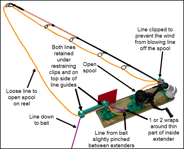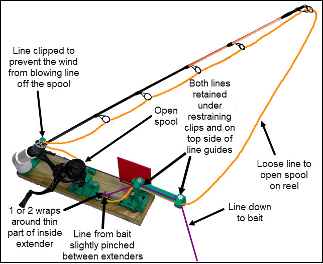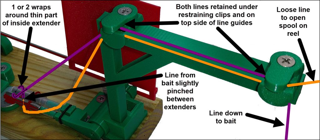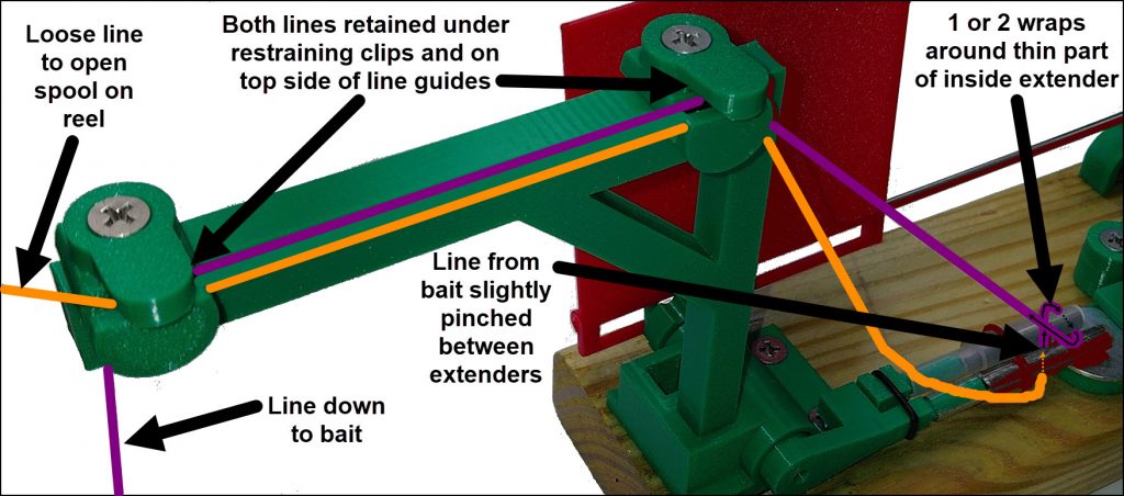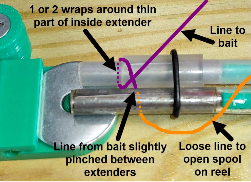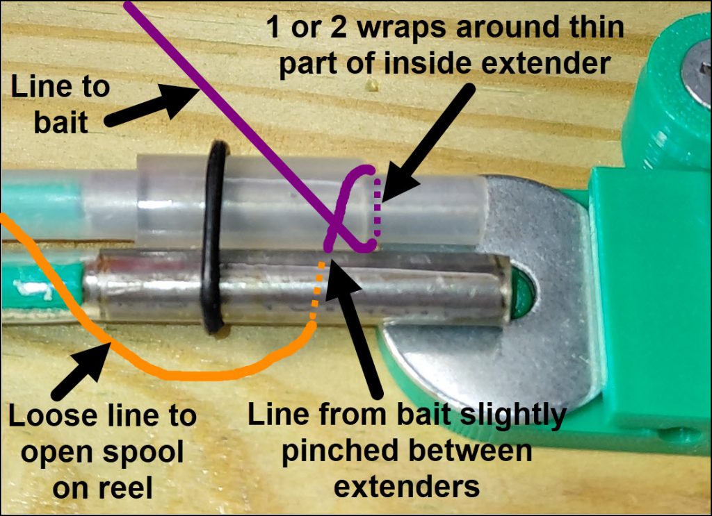 1) Put the line from the bait (purple) between the two extender to create a slight pinch.